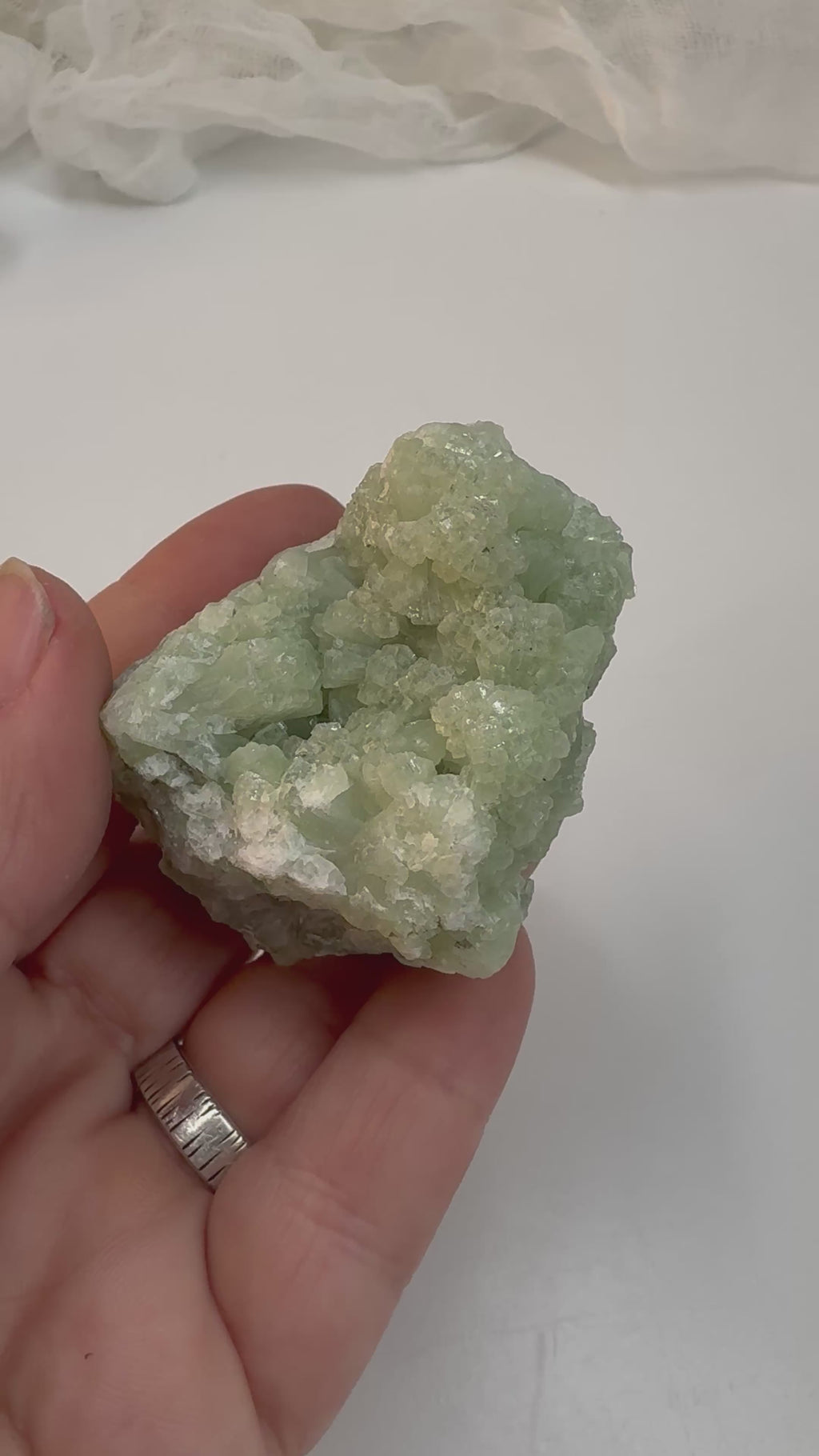 Prehnite is a calcium aluminum silicate mineral that forms soft green, botryoidal or crystalline clusters, often alongside epidote or quartz. It is commonly associated with calm awareness, intuition, and a sense of quiet harmony.