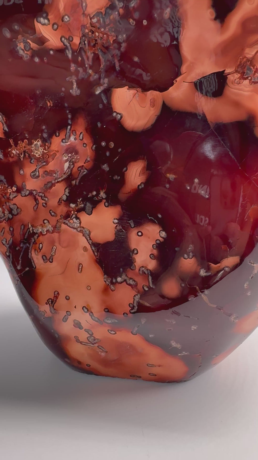 Carnelian, a warm orange-red chalcedony colored by iron, has been prized since antiquity for its smooth luster and translucent depth.