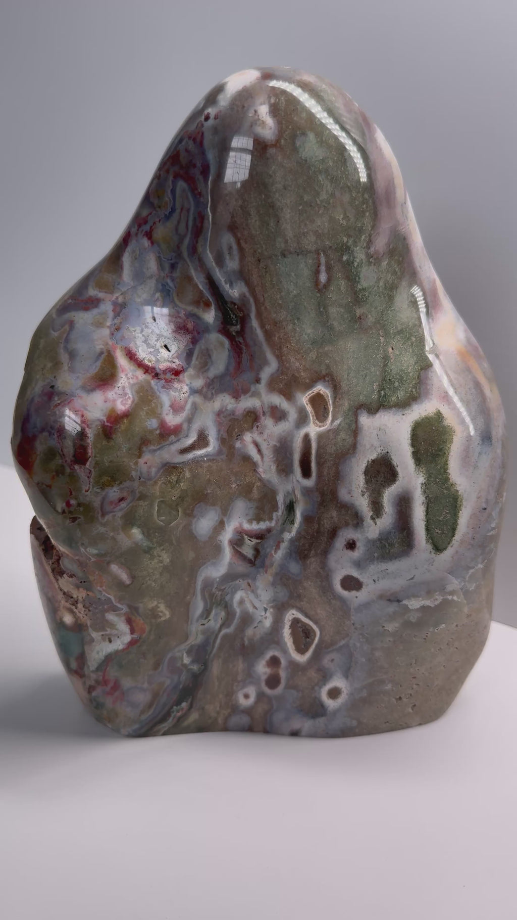 Cosmic Jasper, a trade name for a richly patterned chalcedony containing iron oxides, displays swirling tones of red, gold, and deep green.