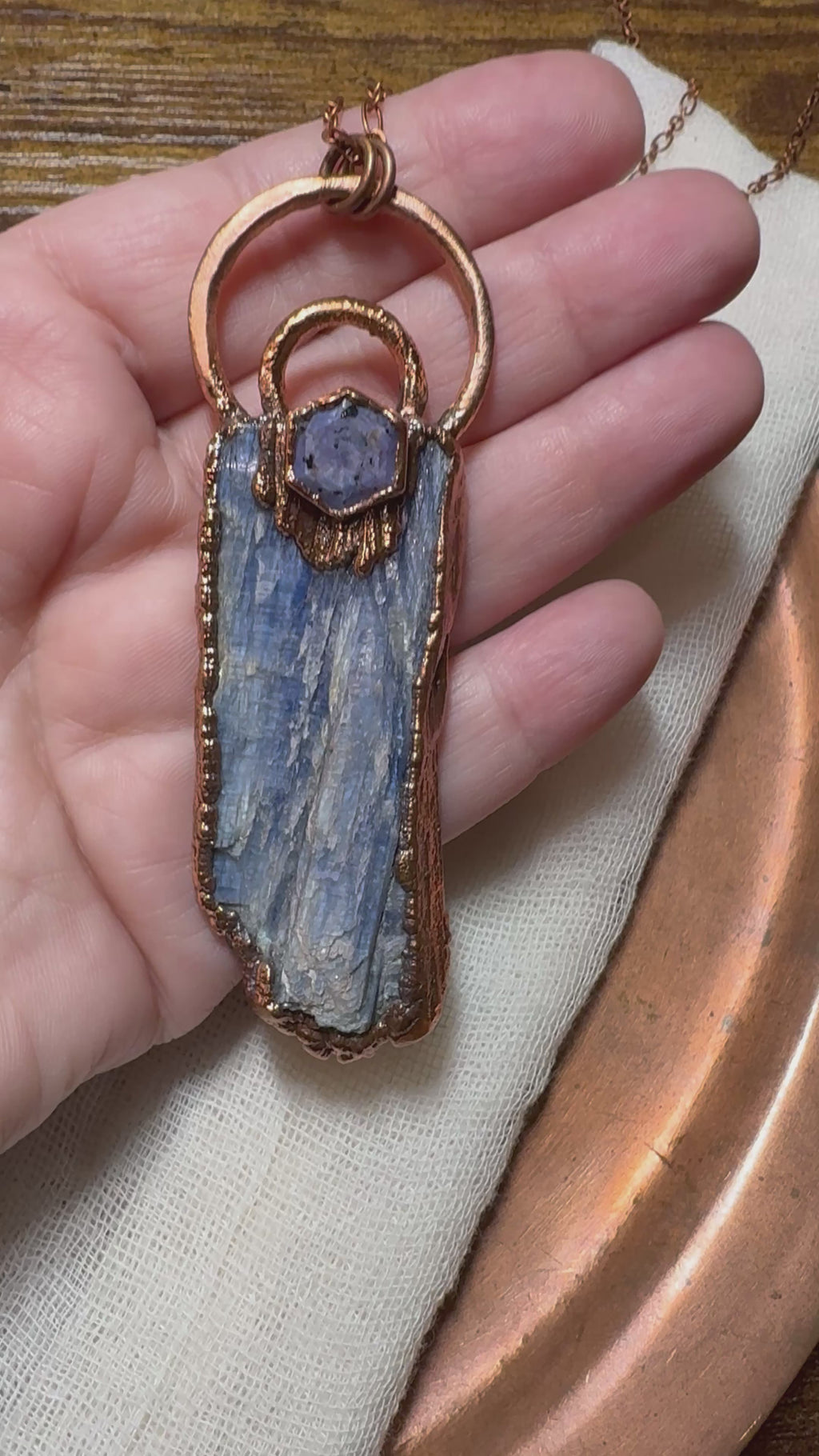 One copper electroformed Blue Kyanite with Ruby on a copper chain.