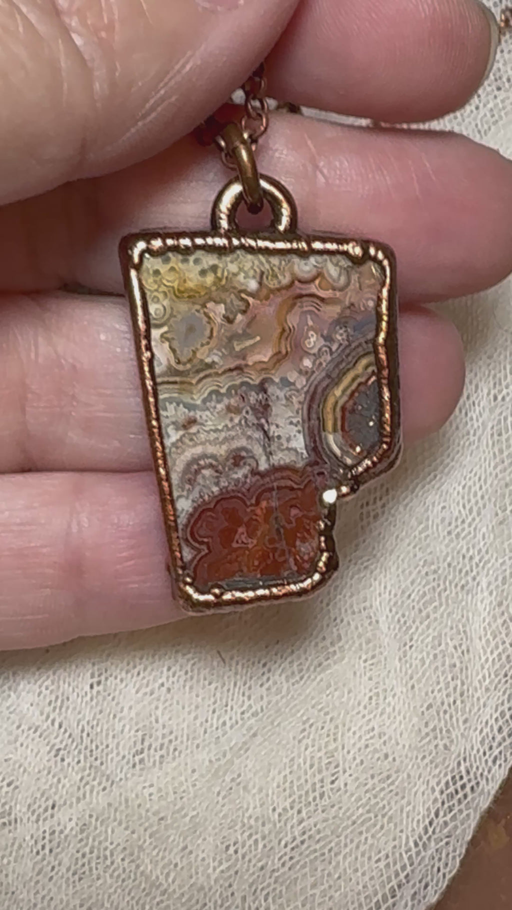 A natural Crazy Lace Agate cabochon electroformed in copper and suspended from a soldered copper chain.