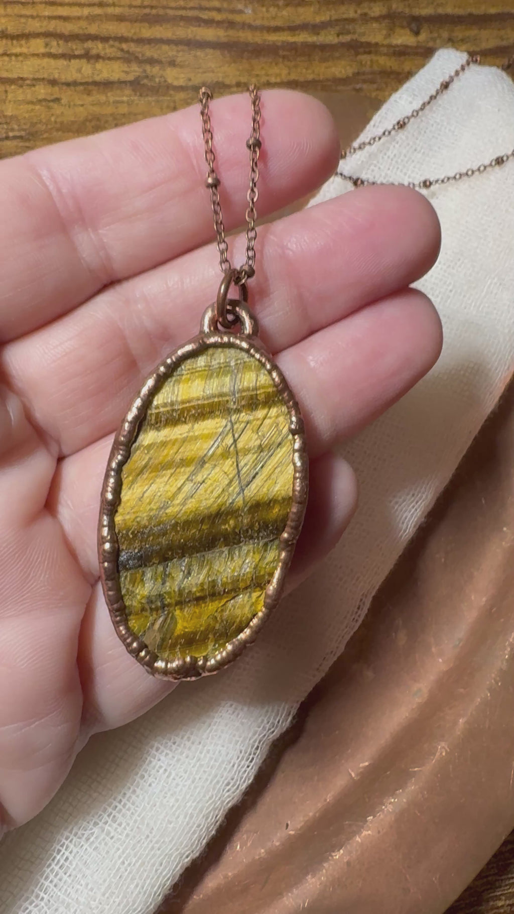 A raw Tiger Eye stone electroformed in copper and suspended from a 20″ soldered copper chain.