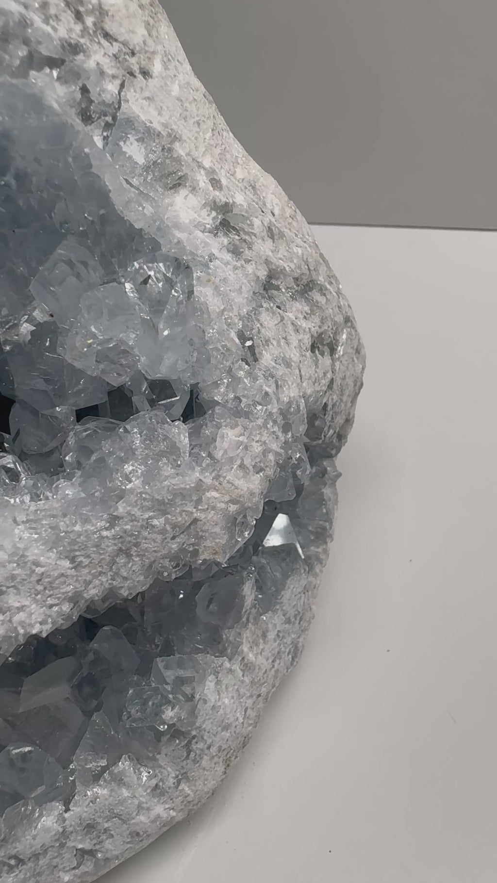Celestite, a strontium sulfate mineral, forms pale blue crystals within geode cavities in sedimentary rock.
