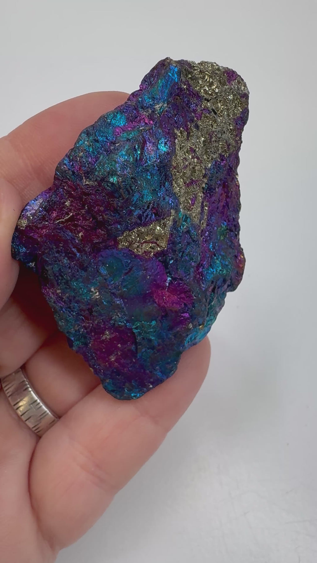 Chalcopyrite is a copper iron sulfide mineral known for its brassy gold tones and natural iridescence that can display flashes of blue, purple, and green as the surface oxidizes. Often associated with creativity and transformation, this specimen highlights the mineral’s raw texture and metallic luster, making it a striking addition to a shelf, altar, or mineral collection.