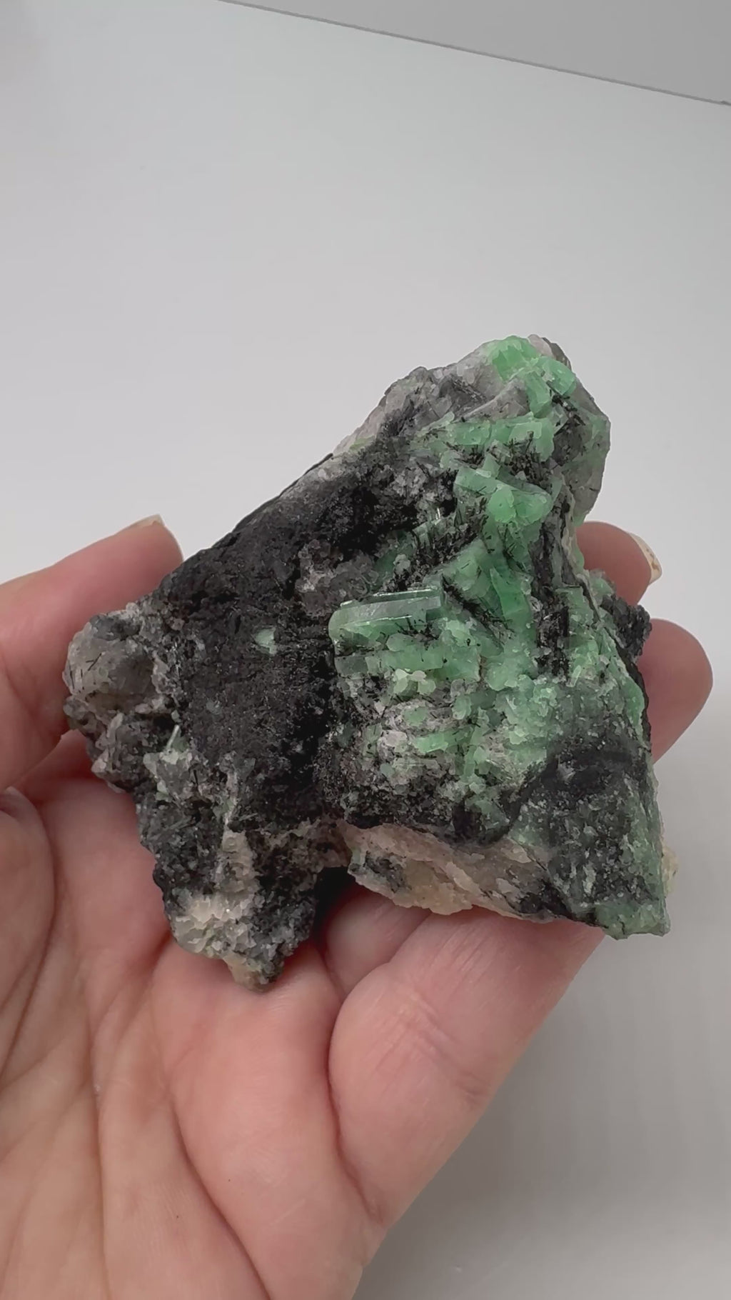 Emerald, the green beryl variety, appears as distinct crystals within quartz and schist matrix, its color derived from chromium-rich fluids during formation.