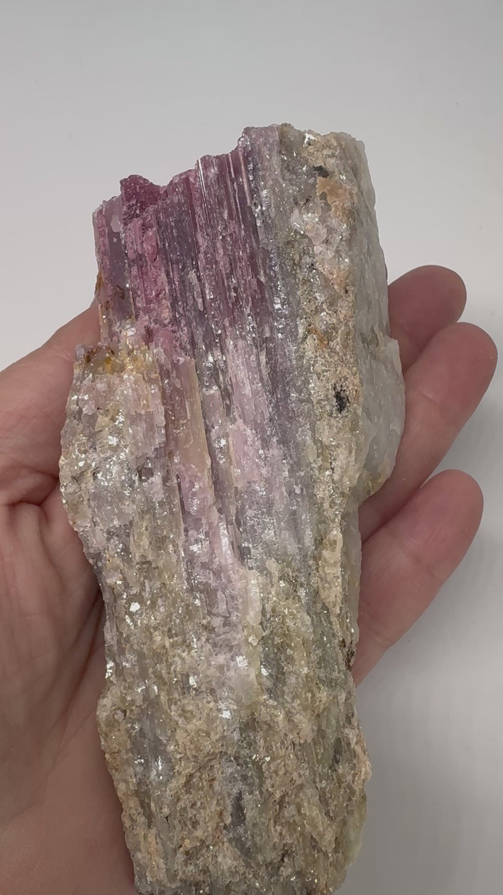 Rubellite, quartz, and lepidolite coexist in lithium-rich pegmatite deposits — a naturally radiant blend sometimes known as “Unicorn Stone.”