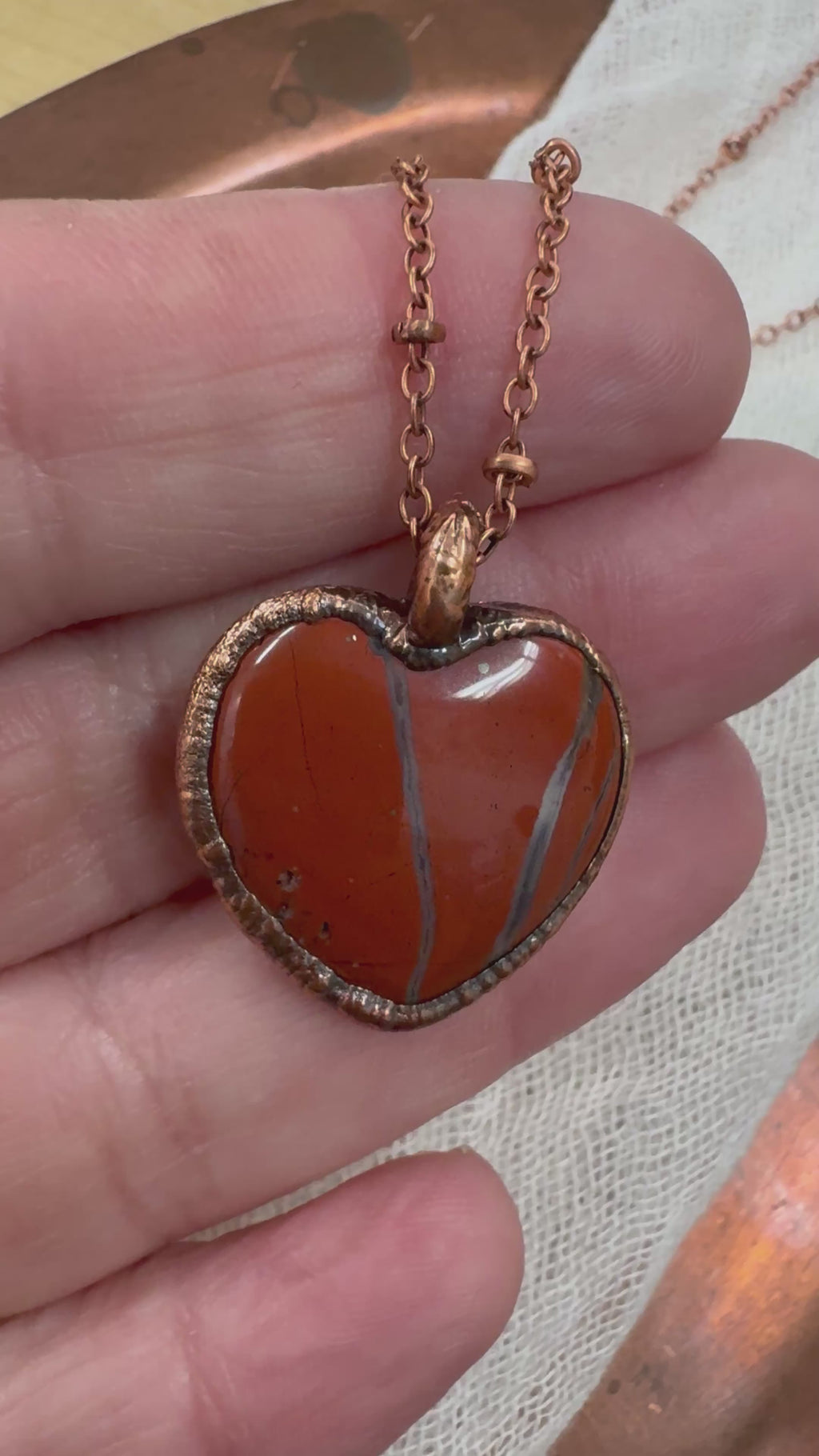 A natural Red Jasper heart cabochon electroformed in copper and suspended from an 18″ soldered copper chain. The pendant highlights the stone’s rich red tones and subtle natural banding, framed by an organic copper edge.